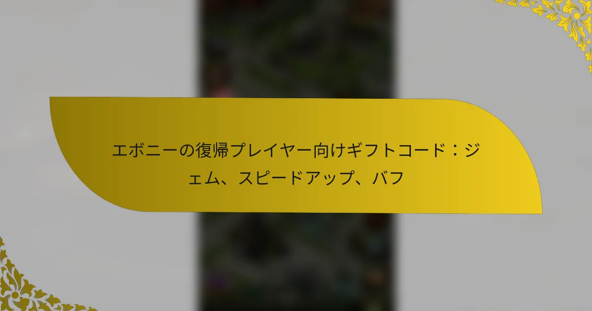 エボニーの特別イベントギフトコードは、プレイヤーが宝石、スピードアップ、資源などの貴重なゲーム内報酬と引き換えられるユニークな英数字の文字列です。プロモーションイベント中に配布されるこれらのコードは、ゲームプレイの進行を助ける重要なアイテムを提供することで、ゲーム体験を向上させます。これらのコードを引き換えるプロセスは簡単で、プレイヤーが特別イベント中に提供される特典を利用しやすくなっています。 エボニーの特別イベントギフトコードとは? エボニーの特別イベントギフトコードは、プレイヤーがさまざまなゲーム内報酬と引き換えられるユニークな英数字の文字列です。これらのコードは通常、プロモーションイベント中に配布され、プレイヤーにゲーム体験を向上させるための貴重な資源を提供します。 ギフトコードの定義と目的 ギフトコードは、ゲーム開発者がプレイヤーを引き付け、イベントへの参加を促すために使用するプロモーションツールです。これらは報酬メカニズムとして機能し、プレイヤーが実際のお金を使わずにゲーム内アイテムを取得できるようにします。 これらのコードの主な目的は、ゲーム内での進行を助けるボーナスを提供することでプレイヤーの満足度を向上させることです。ギフトコードを引き換えることで、プレイヤーは通常はかなりの時間や労力を要する資源にアクセスできます。 利用可能な報酬の種類:宝石、スピードアップ、資源 プレイヤーはギフトコードを引き換える際にさまざまな報酬を期待できます。一般的な報酬の種類には以下が含まれます: 宝石:アイテムの購入やプロセスのスピードアップに使用される貴重な通貨。 スピードアップ:建設、訓練、研究に必要な時間を短縮するアイテム。 資源:ゲームプレイに不可欠な食料、木材、石、鉄などの重要な材料。 これらの報酬は、プレイヤーのゲーム進行能力に大きな影響を与える可能性があり、特別イベント中に非常に求められます。 ギフトコードがゲームプレイを向上させる方法 ギフトコードは、プレイヤーにリソースへの即時アクセスを提供することでゲームプレイを向上させます。たとえば、スピードアップを受け取ることで、プレイヤーは建物のアップグレードや部隊の訓練をはるかに早く完了できます。 さらに、ギフトコードを通じて得られる宝石は、プレミアムアイテムの購入や全体的なゲームプレイを向上させる機能のアンロックに戦略的に使用できます。これにより、より楽しく、ストレスの少ないゲーム体験が得られます。 エボニーにおけるギフトコードの一般的な別名 エボニーコミュニティでは、ギフトコードはさまざまな名前で呼ばれることがあります。一般的な別名には以下が含まれます: プロモコード:ギフトコードと同義で使用されることが多く、そのプロモーション性を強調します。 引き換えコード:報酬のためにコードを引き換える行為を強調します。 イベントコード:特別イベント中に配布されるコードを特に指します。 これらの用語を理解することで、プレイヤーは報酬を獲得する機会を把握し、ゲームプレイ体験を向上させることができます。 エボニーで特別イベントギフトコードを引き換える方法は? エボニーで特別イベントギフトコードを引き換えるのは簡単なプロセスで、プレイヤーは宝石、スピードアップ、資源などの貴重なゲーム内アイテムを取得できます。正しい手順に従うことで、プレイヤーはゲーム体験を向上させ、より効率的に進行できます。 ステップバイステップの引き換えプロセス デバイスでエボニーゲームを開き、アカウントにログインします。 設定メニューに移動し、通常はギアアイコンで表示されます。 「ギフトコード」または「引き換えコード」とラベル付けされたオプションを探します。 提供された通りにギフトコードを正確に入力し、タイプミスがないことを確認します。 入力を確認し、報酬がアカウントに追加されたことを示す成功メッセージを確認します。 成功する引き換えのための要件 エボニーでギフトコードを成功裏に引き換えるためには、プレイヤーは特定の要件を満たす必要があります。まず、コードは有効であり、期限切れでない必要があります。多くのコードは時間に敏感で、特定の期間内にのみ使用できます。さらに、プレイヤーはコードに関連付けられた正しいゲームアカウントにログインしていることを確認する必要があります。 もう一つの要件は、引き換えプロセス中にゲームのサーバーにアクセスするために、プレイヤーがアクティブなインターネット接続を持っている必要があることです。最後に、一部のコードは、ゲーム内で特定のレベルやマイルストーンに達したアカウントにのみ引き換え可能です。 引き換え中の一般的な問題と解決策 プレイヤーはギフトコードを引き換える際にいくつかの一般的な問題に直面することがあります。よくある問題の一つは、コード
